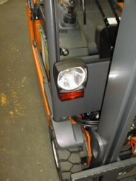 BeleuchtungBeleuchtungseinrichtungen am Flurförderzeug sind in schlecht oder nicht beleuchteten Arbeitsbereichen erforderlich, um dem Fahrer ausreichend Sicht zu gewähren. Da die Beleuchtung nicht zur serienmäßigen Ausstattung gehört, muß sie bei Bedarf nachträglich angebracht werden. Bei Benutzung im öffentlichen Straßenverkehr muß das Fahrzeug entsprechend der Straßenverkehrszulassungsordnung (StVZO) mit Beleuchtungseinrichtungen ausgerüstet sein. > StVZO > Maschinenrichtlinie 89/392 EWG Anhang 1, Absatz 1.4 und 3.1.2 > VBG 36 §12 Absatz 8 (Fahren von Flurförderzeugen)