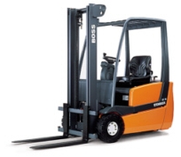 DreiradgabelstaplerDreiradgabelstapler sind Elektro-Fahrsitz-Gabelstapler, deren Geometrie der Radbasis einem Dreieck gleicht. Die Hinterachse mit einem Rad oder Zwillingsrad dient als Lenkachse. Der Antrieb erfolgt meist über die Vorderachse. Das gelenkte hintere Rad kann bis zu 90 Grad eingeschlagen werden und ergibt somit einen sehr kleinen Wenderadius. Dies ist ein wesentlicher Vorteil gegenüber einem Vierradstapler mit gleichen Abmessungen. |