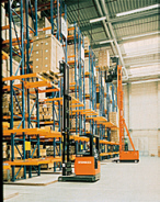 Hochregalstapler Der Hochregalstapler gehört zu der Flurförderzeug-Modellreihe der Seitenstapler. Er wird als reines Lagergerät in engen Gängen mit seitlich angeordneten Regalen eingesetzt. Die Lastaufnahmemittel werden beim Stapelvorgang entweder seitlich verschoben oder die Gabel bzw. der ganze Mast geschwenkt und dann verschoben. Ausführungsformen : - der Lastträger ist quer zur Fahrtrichtung angeordnet und muß entweder nach einer oder nach beiden Seiten verschiebbar sein - In engen Gängen kann man die Paletten nur in die Regale ein- und ausstapeln, aber nicht im Gang absetzen oder aufnehmen - der Lastträger ist nach beiden Seiten um 90 Grad sowie quer zur Fahrtrichtung waagrecht verschiebbar - somit ist neben der seitlichen Aufnahme der Last auch eine frontale möglich - der Lastträger besteht aus einer Gabel - C-Gabel-Dreiseitenstapler