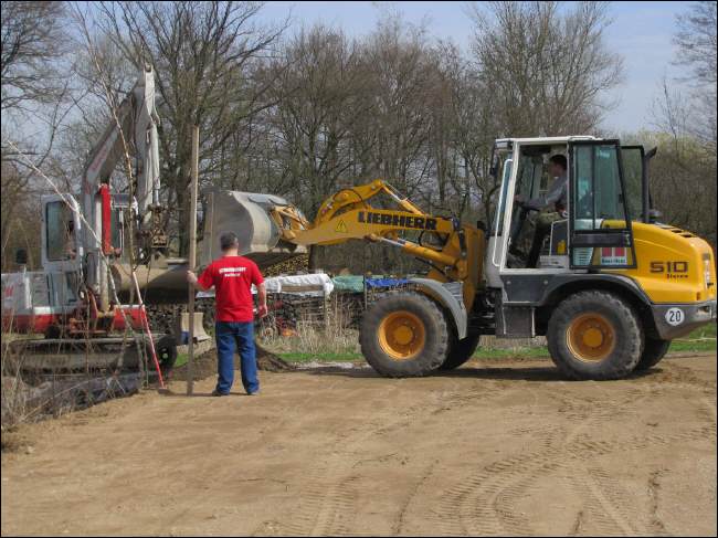 Bei uns werden Sie real und praxisnah ausgebildet Unter Fachaufsicht auf einer Baustelle wird gründlich unterwiesen. Wie hier im Beispiel - Einebenen mit Laser-Nivilierung unter Zuhilfenahme von Lader und Bagger