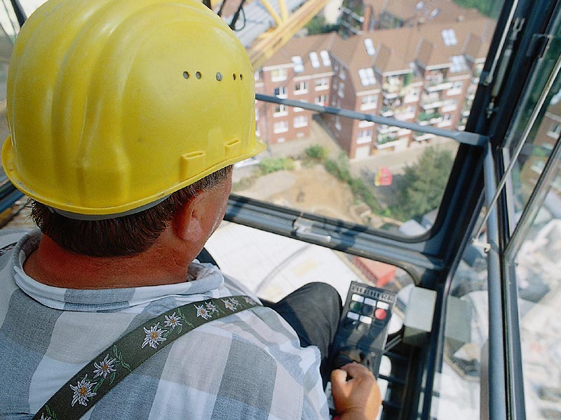 In der Führerkabine beim Bedienen des Krans (Turmdrehkran), äußerste Konzentration und Freude am Einsatz steht an erster Stelle.